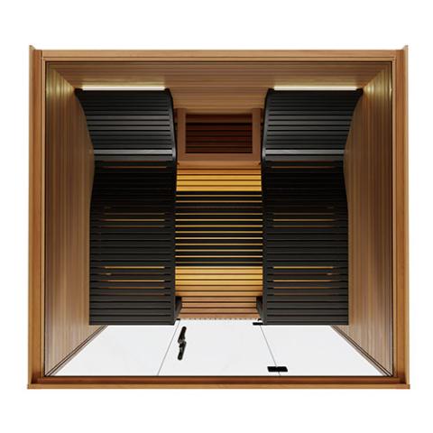 Innovative design and artisanal craftsmanship combine to create the luxurious Relaxia indoor home sauna from Auroom. Ergonomically shaped satin-smooth black wax-coated Thermo-Aspen benches follow the contours of your body for supreme comfort and contrast beautifully with the rich warm tone of the Thermo-Aspen interior. The impressive 8mm thick tempered full glass front wall features a frameless glass door with matte black door pulls and matching hinges. Attention to detail is apparent throughout, with hidden fasteners for a premium, furniture-quality appearance. Dimmable “dotless” LED lighting hidden behind the benches elegantly illuminate the environment to suit your mood. The Relaxia includes genuine Auroom accessories to further elevate your experience, including sauna bucket and ladle, thermometer and hygrometer, sand timer, sauna hat, sauna pillow, and aroma set. Enjoy uncompromising comfort and quality for an unmatched sauna experience with the Relaxia from Auroom.