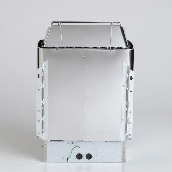 Harvia KIP Series heaters are perfect for home saunas and this version has built-in controls at the base of the heater for on/off, temperature, delayed start, and timed shut off. It is a traditional, wall-mounted sauna heater with a large stone capacity to create lots of steam and hold a steady temperature. The heater is constructed with stainless steel and includes a protective stone guard.